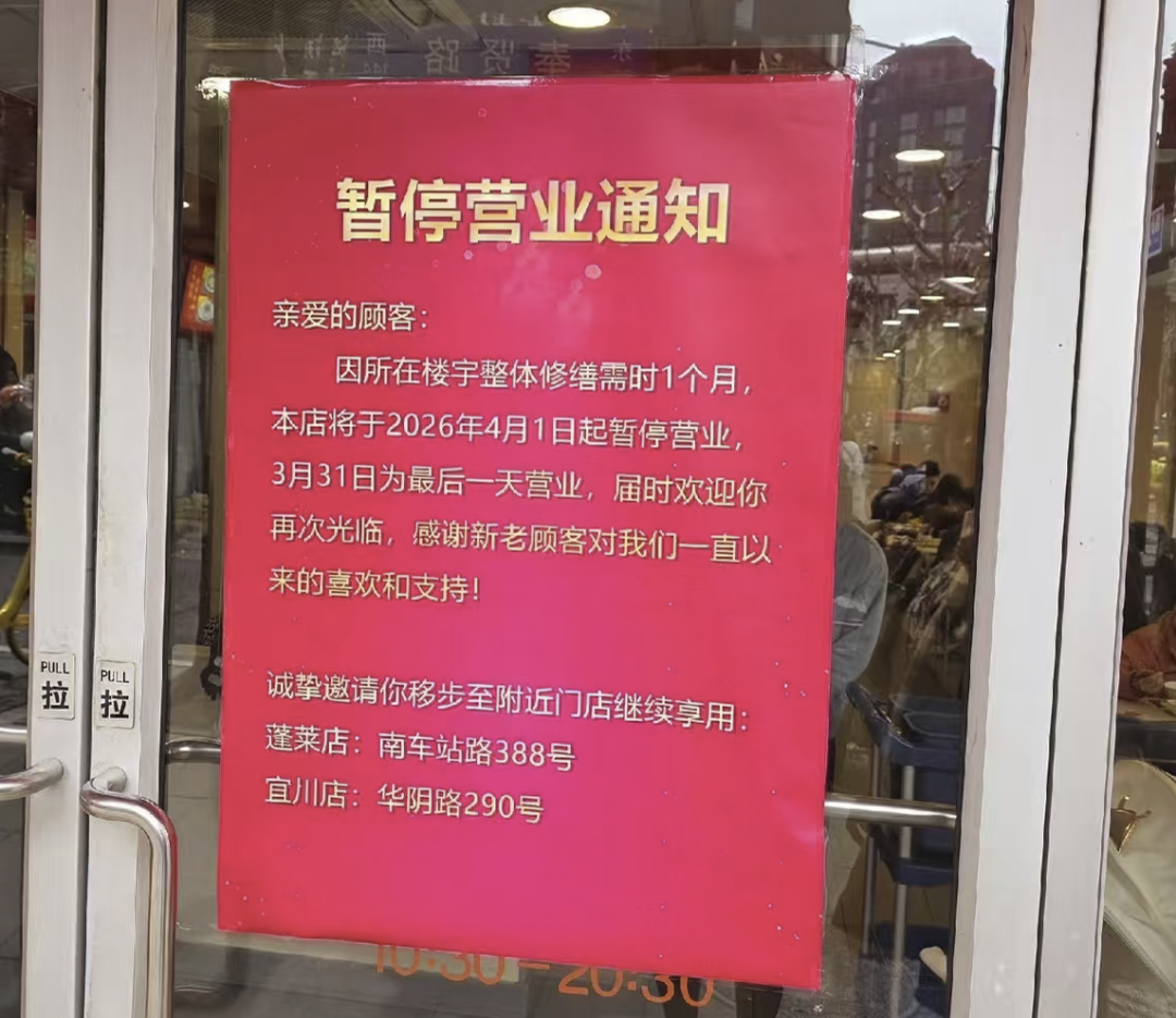昨天(3月31日)网红小吃“阿大葱油饼”石路途店短暂贴出见告告示“暂停交易”尊敬的主顾一又友们:因方位楼宇将进行举座修缮,阿大葱油饼店自2026年3月31日交易适度后,暂停交易。咱们正在另寻恰当位置重新开业,具体开业时期敬请关怀后续见告。
