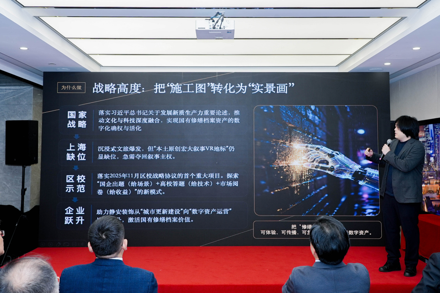 2026年是“十五五”规划开局之年。为响应静安区委、区政府“两轴一带三片区”战略部署,推进教育、科技、人才一体化发展,1月27日,“上海石库门修缮工艺数字孪生联合实验室建设及LBE大空间VR沉浸叙事系统研发”战略合作签约仪式在上海静安建筑装饰实业股份有限公司举行,旨在推动上海石库门保护修缮的数字化转型,实现石库门文化传承与数字技术创新深度融合,强化企业科技创新主体地位。
