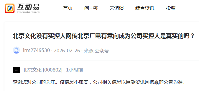 日前,有投资者在互动平台向北京文化发问:北京文化莫得实控东谈主,网传北京广电有利向成为公司实控东谈主是着实的吗?北京文化(000802)3月2日回应称,该信息不属实。
