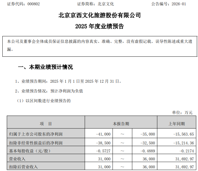 最新功绩方面,1月30日,北京文化(000802)2025年功绩预报,瞻望2025年度归母净利润-4.1亿元至-3.5亿元,较上年同时的亏空1.56亿元大幅加多;扣除非时时性损益后的净利润瞻望为-3.85亿元至-3.25亿元,交易收入瞻望在3.1亿元至3.6亿元之间。