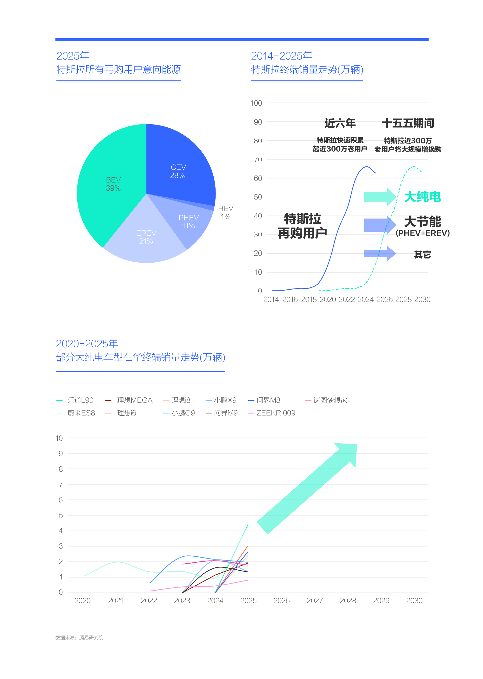 2025年,虽然问界、理想、腾势等主打增程、插混等大节能品牌,率先受益特斯拉再购用户,但之前仅涌现少部分特斯拉再购用户,且其它能源形式的产品尚未大规模布局,所以暂不能得出节能车最适合特斯拉再购用户的观点,保不齐半路就会杀出一个程咬金,尤其是大纯电产品。2025年特斯拉再购用户意向选购纯电的占比逼近40%(不等于大纯电,含小电动);