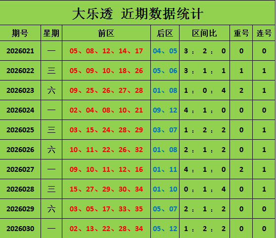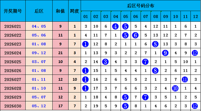 上期后区开出号码05 12,和值17,近十期和值9 11 9 21 10 9 12 11 12 17,和值波动范畴较大,本期预测和值会下落,要点关怀号码:02 07,和值9。