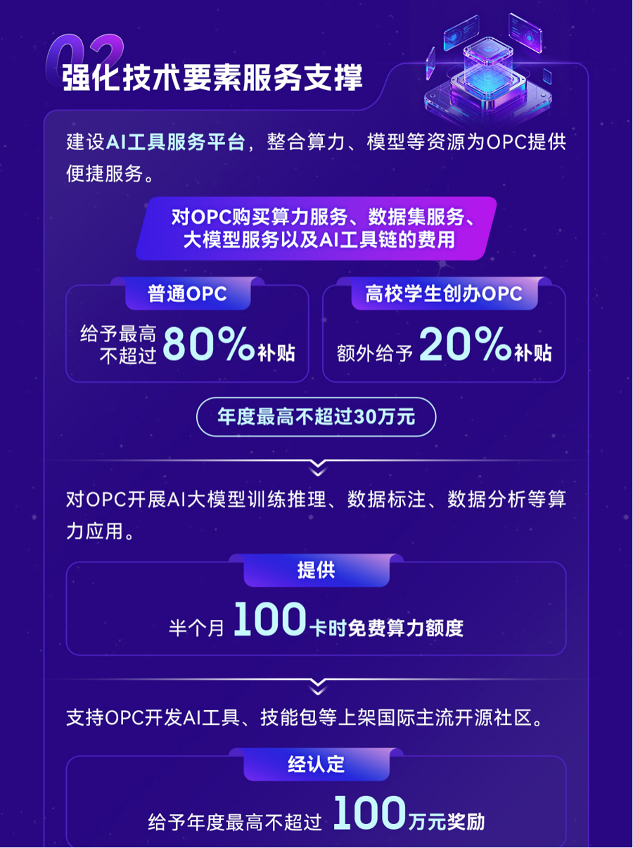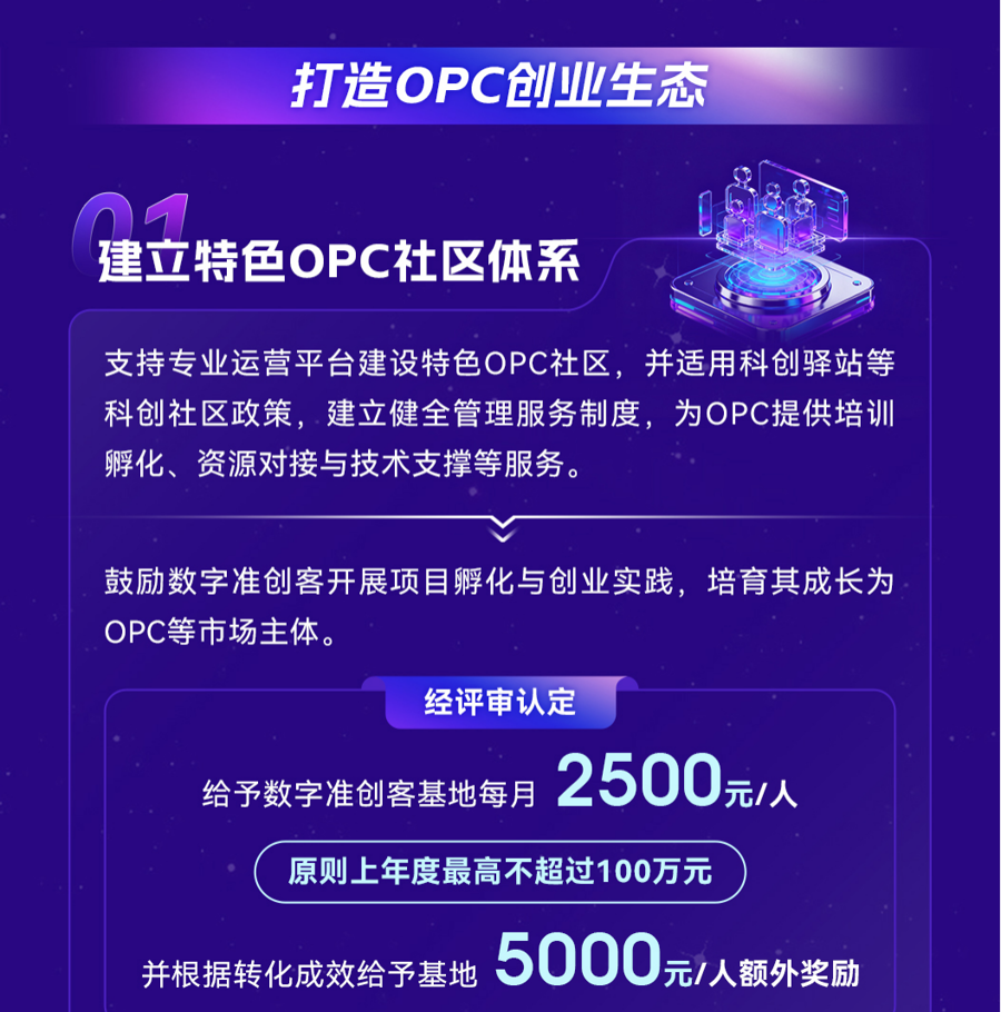 策略支捏专科运营平台成立本性OPC社区,并适用科创驿站等科创社区策略,配套培训孵化、资源对接与时代因循管事;对数字准创客孵化基地,赐与每月2500元/东说念主的运营补贴,原则上年度最高不卓越100万元,还可字据技俩转移奏效享受5000元/东说念主的特地奖励;对成立AI用具管事、数据管事等功能性平台的机构,按年度管事奏效赐与最高不卓越100万元奖励。