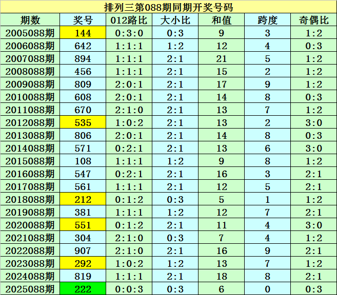 本期为陈设三第2026088期开奖,开奖日历为:2026年4月8日,历史上陈设三第088期已开出了21次奖号,积年同时开出号码隔离为:144-642-894-456-809-608-670-535-806-571-108-547-561-212-381-551-304-907-292-819-222。