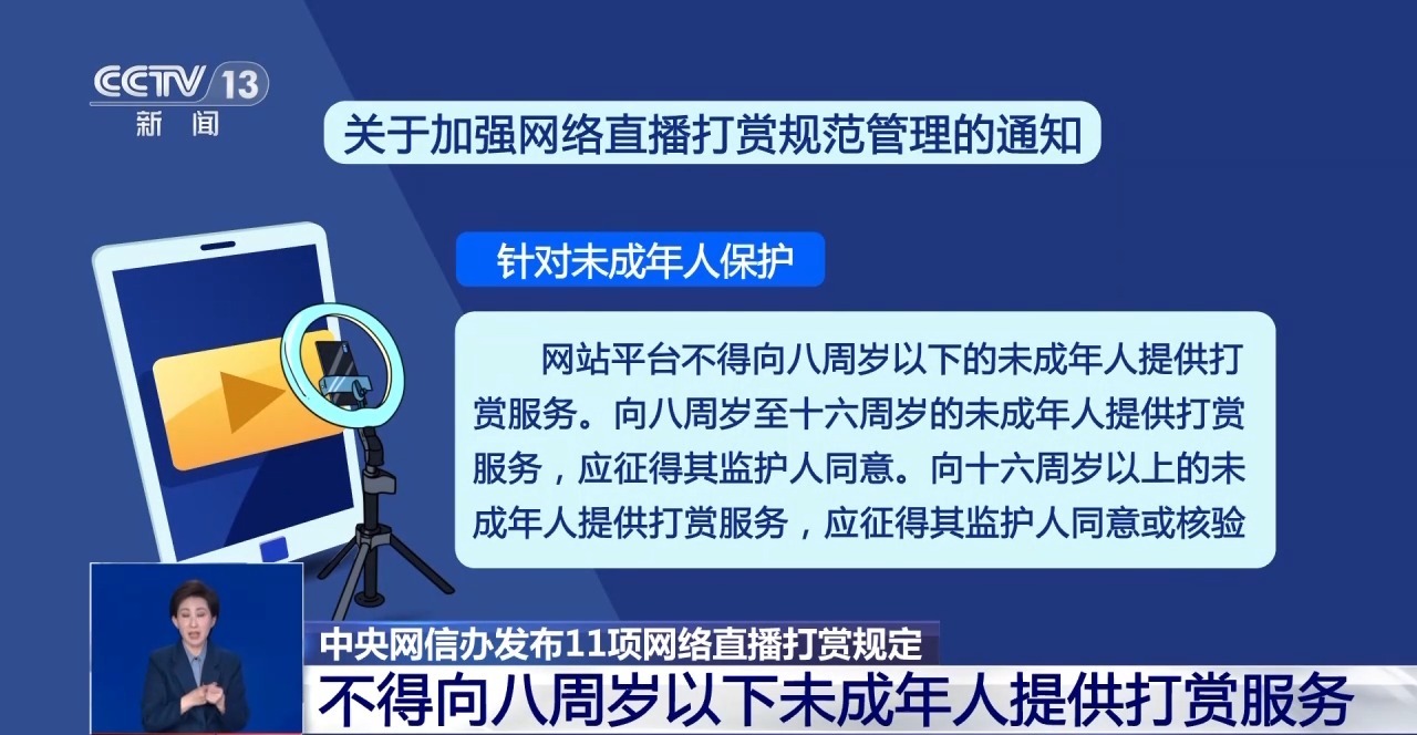 记者今天(13日)从中央网信办获悉,为进一步加强收罗直播打赏管制,规律收罗直播渔利举止,股东网站平台合规健康运营,切实爱戴网民正当权利,中央网信办发布“对于加强收罗直播打赏规律管制的见告”。