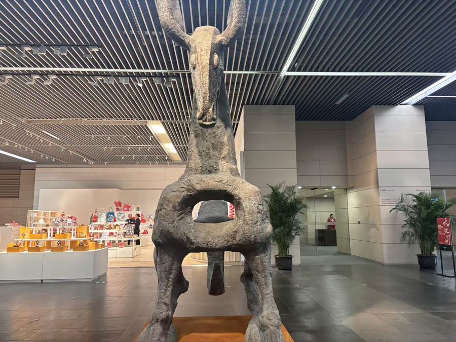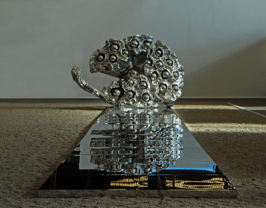 序章“山河巨丽”从户外广场开始,《龙马》、高达9米的《剧神之柱》等作品直接将观众拉入一个气势磅礴的雕塑世界。走进上海美术馆0米层大厅,第一章“生命意象”转向对自然生灵的诗意凝望,一条由镜子铺成的“水路”直通向一颗金属质地的莲蓬头,这是曾成钢的代表作之一《莲·水》。《精灵系列》里的小动物则被赋予青铜器般的霸气,《绵羊》《公鸡》脱胎于青铜礼器“爵”,形体被夸张为充满张力的弯钩造型。