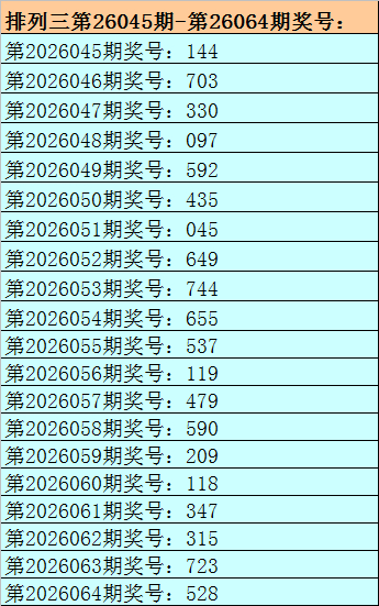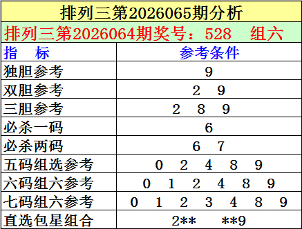 1.陈设三最近十期差别开出号码:537-119-479-590-209-118-347-315-723-528,其中有7期奖号开出了上期的重叠号码,本期展望第2026064期奖号:528中有重号,参考号码:2。