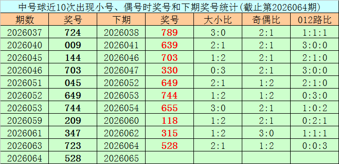 在中号球前10次开出小 号、偶号类型之后,其下期阔别开出奖号:789、639、703、330、649、744、655、118、315、528,其中号码大小比为2:8,012路比为3:4:3,奇偶比为5:5。