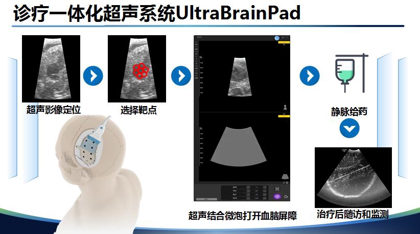 此次项目组带来的“中国方案”是第三种方案,它完全基于超声的半侵入式技术,小型手持式超声探头观察患者脑内情况,超声影像实时呈现在UltraBrainPad屏幕上,医生在屏幕上手触式选取多个治疗靶点,启动超声波,就可实现所有靶点区域血脑屏障同时打开,操作便捷、成本节约、精准度高,配合AI图像识别技术,能可视化观测到血脑屏障开放程度,安全可靠,在基层医院就可以完成相关治疗过程。