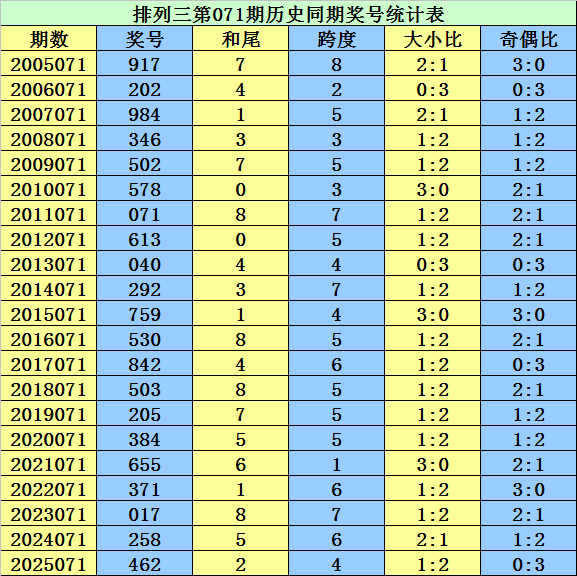 奇偶比参考:在第071期陈列三历史同时中,奖号奇偶比1:2→7期,2:1→7期,0:3→4期,3:0→3期,其中奇偶号码总比例开出30:33,偶数开出较多,本期要点脸色奇数热出,防全奇出现。