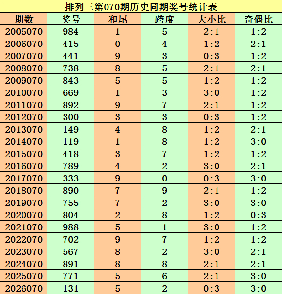 和尾推选:陈列三第071期历史同时,和尾奇偶比开出10:11,大小比开出10:11,012路比开出5:9:7,奖号和尾开出期数诀别为:和尾 8→4期,和尾1、4、7→3期,和尾0、3、5→2期,和尾2、6→1期,和尾9→0期,本期符合脸色奇和尾出现,参考和尾7。