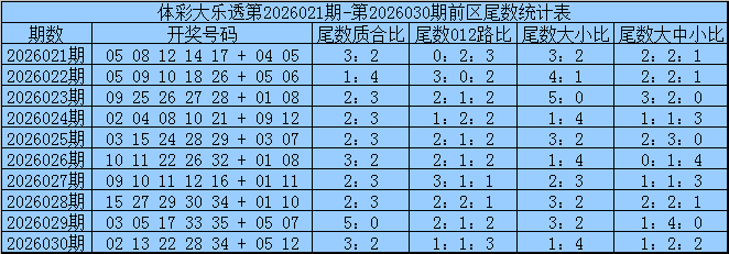 当期红球号码大小比为3:3,三区比为3:1:2,奇偶比为2:4,3组连号02,03,04,31,32。蓝球开出【小偶】形态的号码4。