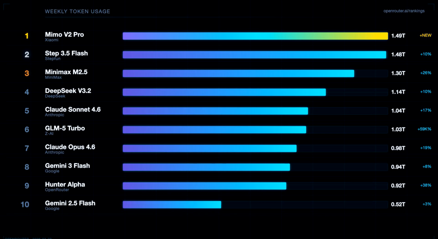 更值得轻柔的是,在各人词元调用榜单中,国产大模子已取代ChatGPT、Gemini、Claude等好意思国模子,小米MiMo、阶跃Step、MiniMax与DeepSeek等国产模子占据主导位置。