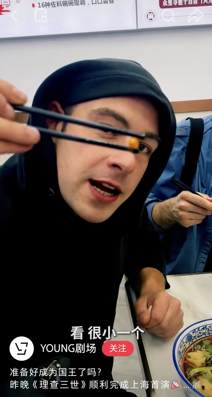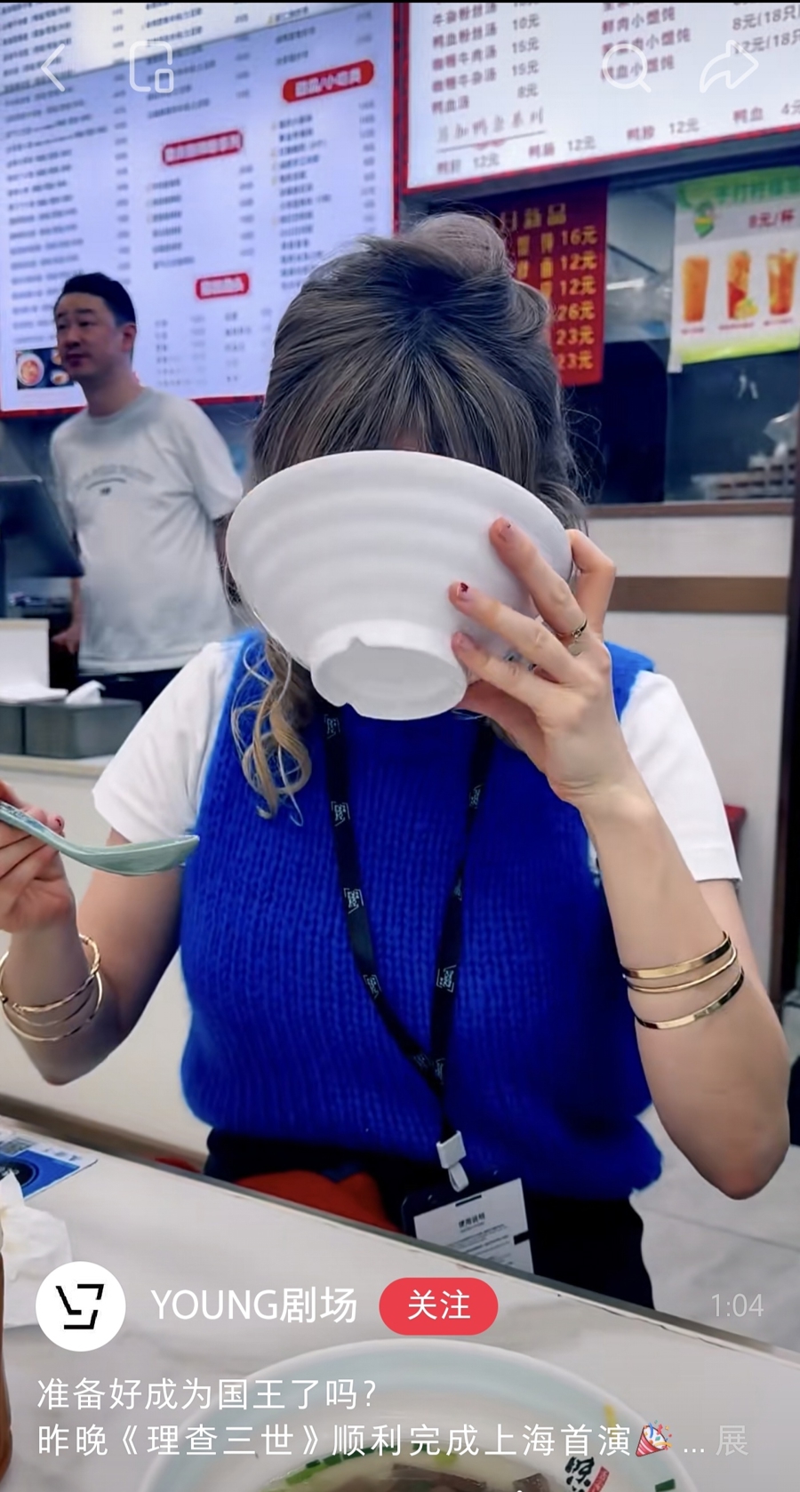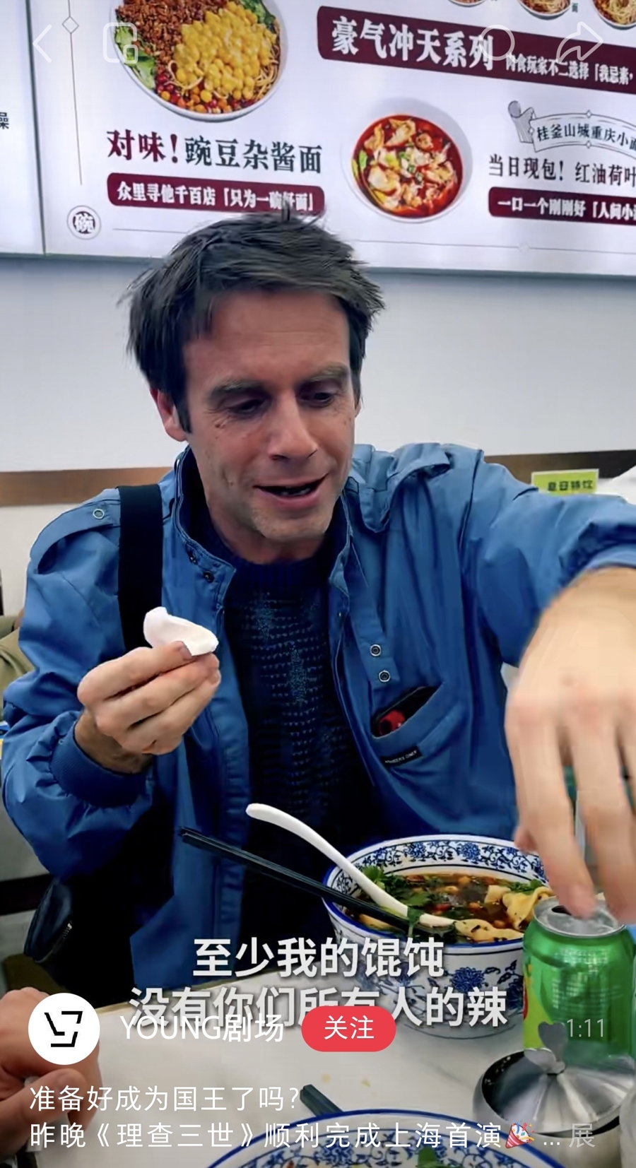 YOUNG剧场转载《理查三世》剧组拍摄视频,其中有不少演职人员在馄饨店画面,大家都对上海美食充满兴趣