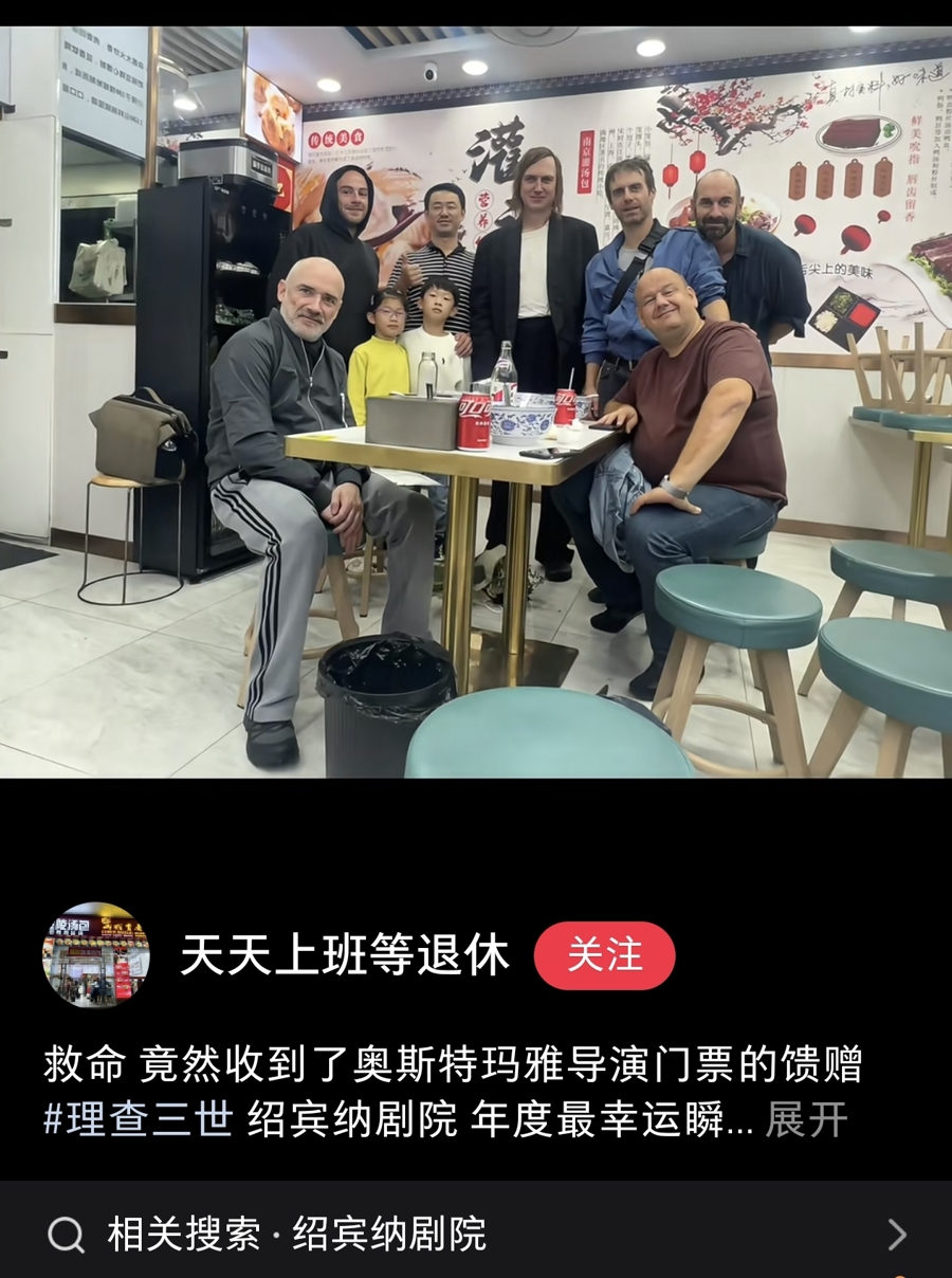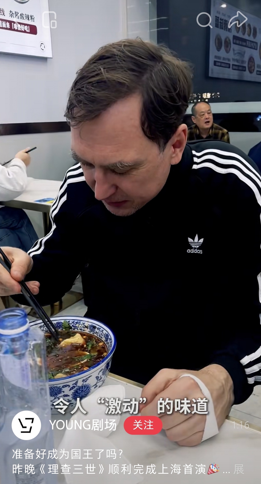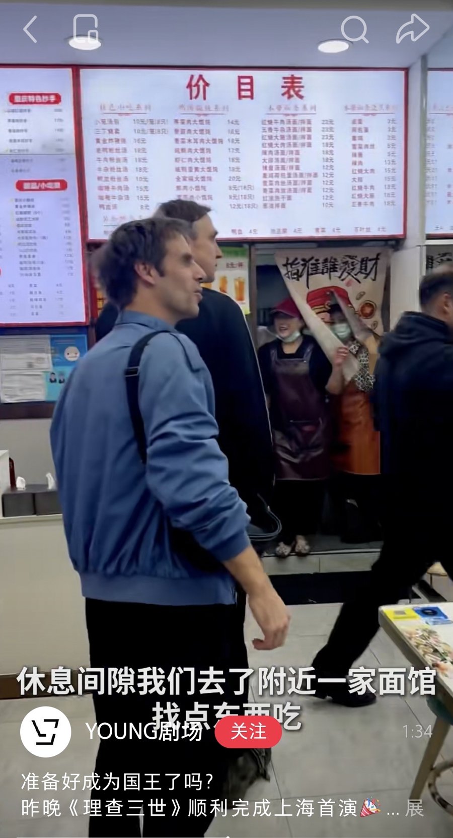 YOUNG剧场转载《理查三世》剧组拍摄视频,其中有不少演职人员在馄饨店画面,大家都对上海美食充满兴趣