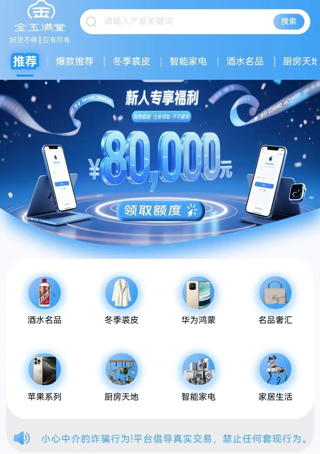 金玉满堂小设施首页展示的可购买商品和免责教导。