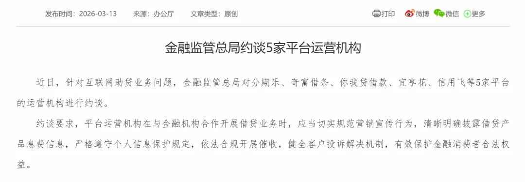 3月13日,国度金融监管总局发布音讯称,约谈5家平台运营机构。