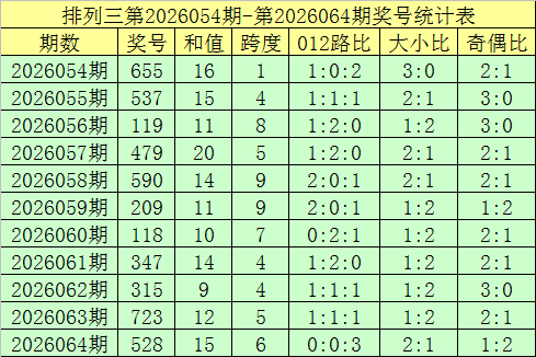 开奖追想:枚举三第2026064期奖号开出:528,组选类型:组六,大小比为2:1,奇偶比为1:2,和值为15,跨度为6。